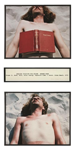 Reading Position for Second Degree Burn, 1970. Jones Beach, New York. Skin Book, solar energy. Duration of Exposure: 5 hours – “The piece incorporates an inversion of reversal of energy expenditure. The body is placed in the position of recipient… an exposed plane, a captive surface. The piece has its roots in a notion of color change. Painters have always artificially instigated color activity. I allow myself to be painted – my ski becomes pigment. I can regulate its intensity through control of exposure time. Not only do the skin tones change, but change registers on a sensory level as well. I feel the act of becoming red.” D.O.