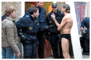 Ulay towards the police that clear out a squat, stand up with the vulnerability of the naked body, 2006